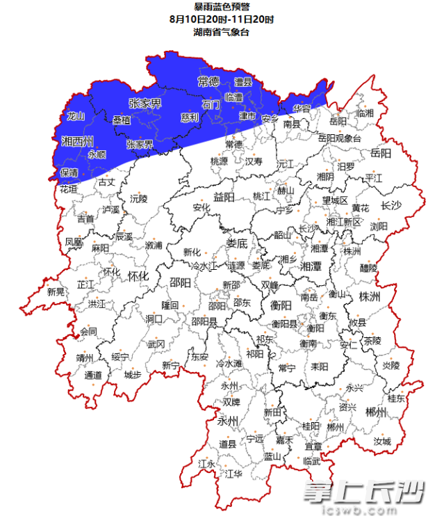 长沙晚报掌上长沙8月10日讯(全媒体记者 舒元臻)湖南省气象台10日16时发布暴雨蓝色预警:预计10日20时至11日20时,湘北部分地区将出现暴雨,其中湘西州北部、张家界北部、常德北部地区局地有大暴雨(100毫米到120毫米),并伴有短时强降水(最大小时雨强50毫米到70毫米)、雷雨大风(局地阵风6到8级)等强对流天气,请加强防范。