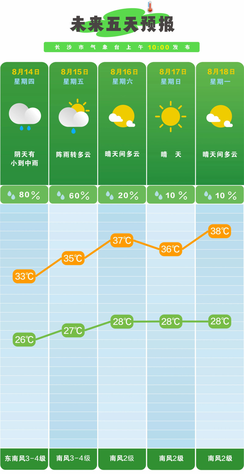 与此同时,长沙市气象台预计,14日白天到夜间,受台风外围偏东风扰动影响,长沙大部分地区有小到中雨,局地可能出现短时强降水(20毫米到30毫米/小时)、雷暴大风(6到8级)等强对流天气。虽然台风“杨柳”暂时缓解了高温,但16日到20日,副高控制,长沙将转为晴热高温天气,最高气温升至38℃左右。