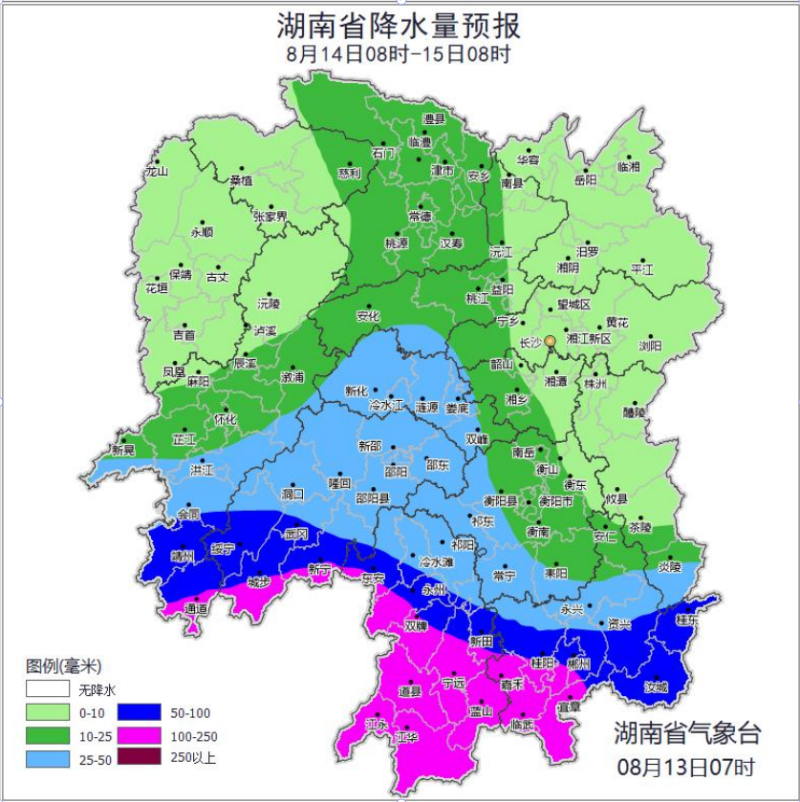 具体来看,13日,益阳、岳阳西部和北部、邵阳北部、怀化南部、娄底西部、郴州东部部分地区中到大雨,局地暴雨,局地阵风6到8级,最高气温湘南33℃至36℃,其他地区27℃至32℃;14日,湘中以南有大到暴雨,其中郴州(市区、桂阳、嘉禾、临武、宜章)、永州(市区、江永、江华、道县、宁远、蓝山、双牌、新田、东安)、邵阳(城步、新宁)、怀化(通道)大暴雨,单点特大暴雨,局地阵风7到9级,最高气温湘东34℃至37℃,其他地区28℃至33℃;15日,湘西中到大雨,其中怀化中南部、湘西州南部暴雨,局地阵风6到8级,最高气温湘东34℃至37℃,其他地区28℃至33℃。