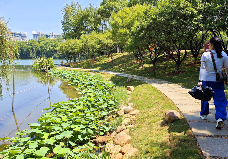 公园内,老人们穿着薄外套,三五成群沿着湖边散步,不时停下脚步交流家常,享受久违的舒适风;家长们推着婴儿车,陪孩子在草坪上玩耍;年轻人则一边欣赏湖景一边品尝冷饮,清凉的惬意让人精神清爽。