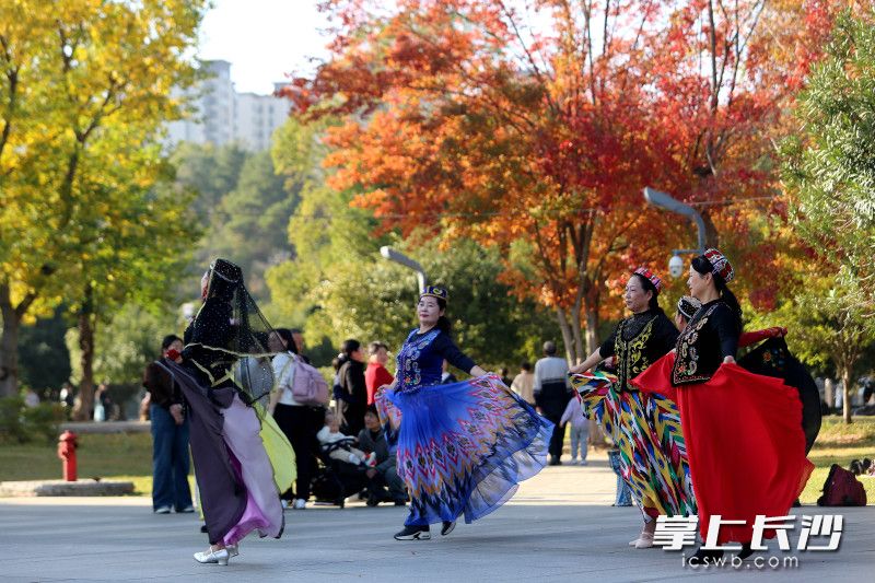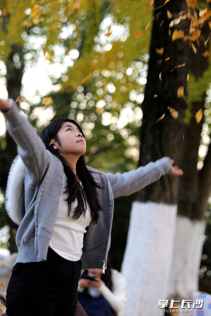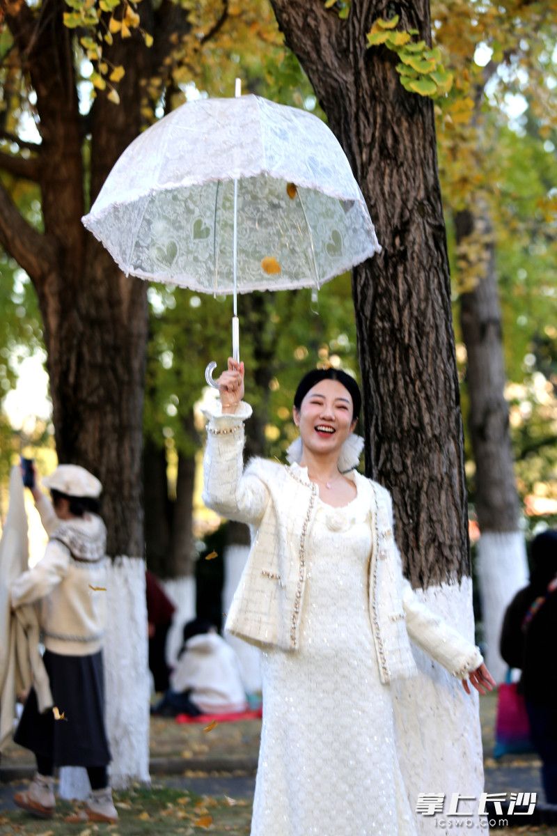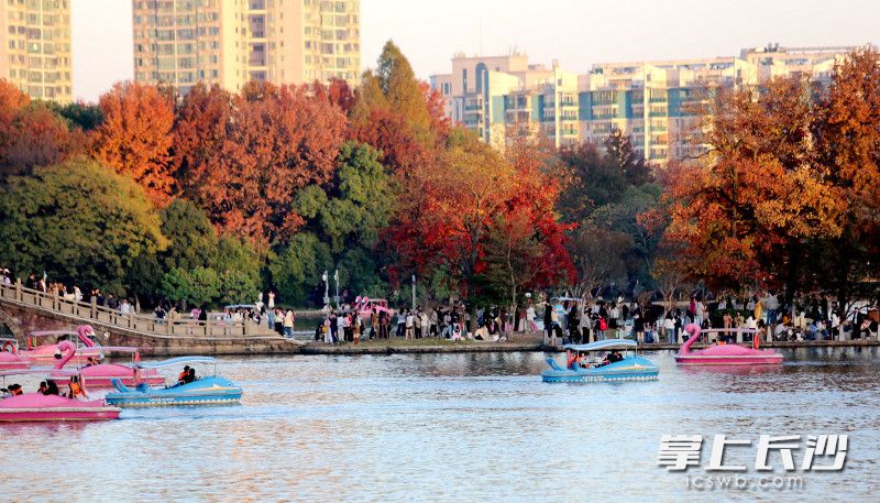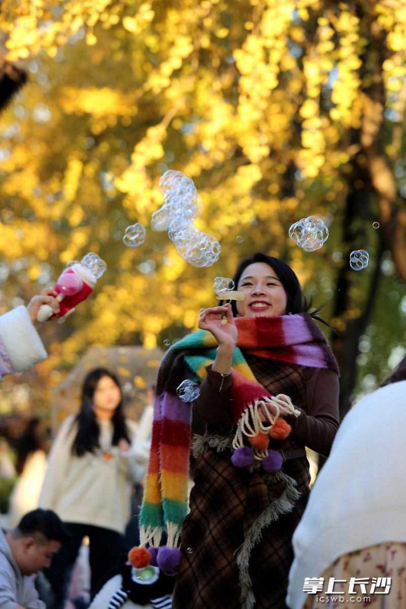 今日上午,记者走进湖南烈士公园,年嘉湖畔的银杏林率先映入眼帘。暖阳下,金黄的银杏叶如蝶翼般飘落,铺满了步道,红色的小火车穿梭其间,仿佛驶入童话世界。市民带着相机驻足拍摄,孩子们则在树下追逐嬉戏,拾起落叶拼成各式图案,欢声笑语在林间回荡。