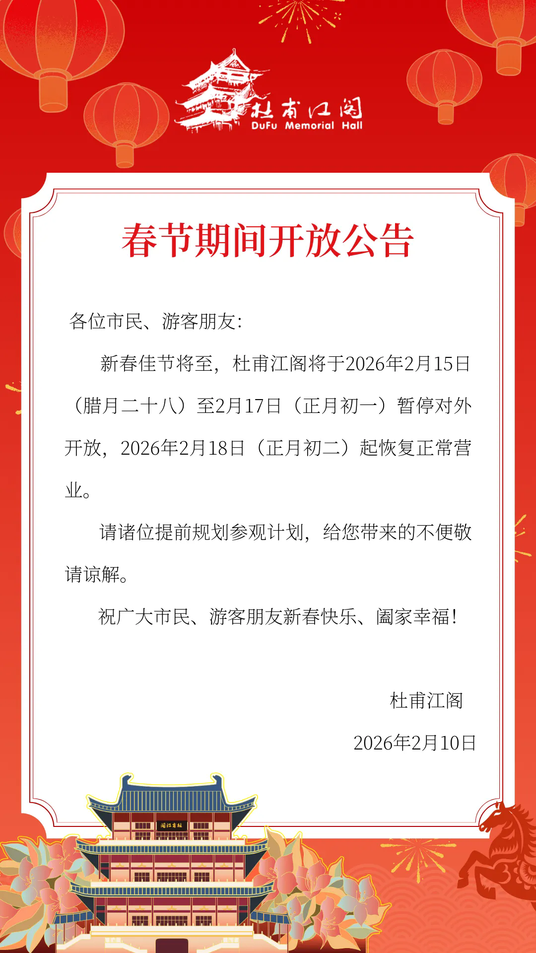 杜甫江阁春节期间开放时间调整公告 稿源:杜甫江阁2026-02-10 15:54 相链区块链 该文章已上链>> 您的浏览器不支持 video 标签。 您的浏览器不支持 audio 标签。 【作者:】 【编辑:刘天乐】 长沙晚报社版权声明 关键词:杜甫江阁 >>我要举报