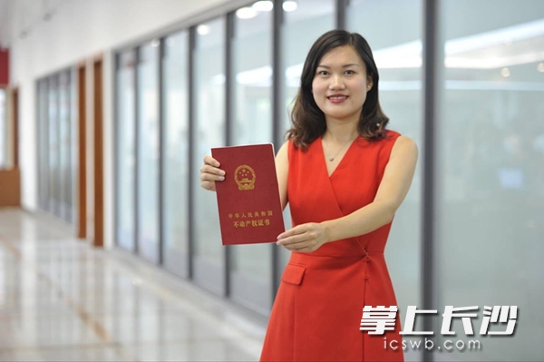市民郭靓领到长沙市本级首本不动产权证书。长沙晚报记者王志伟摄