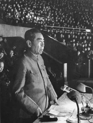 1955年4月,周恩来在万隆会议上。这是由二十九个亚非国家组织的,没有西方国家参加的国际会议。周恩来在会上大力提倡和平共处五项原则,坚持“求同存异”方针,促使会议获得圆满成功。