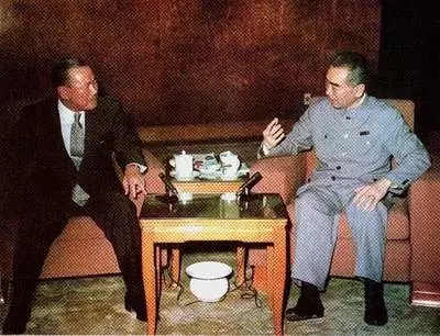 1958年2月,周恩来率领中国政府代表团访问朝鲜。周恩来与金日成。