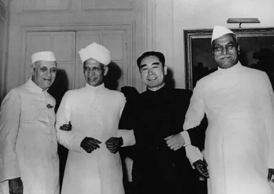 1953年12月31日,周恩来在会见印度政府代表团时第一次提出和平共处五项原则。这是1954年6月下旬,应邀访问印度时,和印度总统拉金德拉·普拉沙德(右一)、副总统萨瓦帕利·拉达克里希南(右三)、总理贾瓦哈拉尔·尼赫鲁合影。