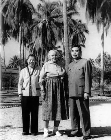 1960年2月,周恩来和邓颖超在海南岛同美国进步女作家斯特朗合影。