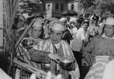 1960年4月,周恩来访问缅甸时,身着缅甸民族服装,手持银碗,同缅甸人民欢庆泼水节。