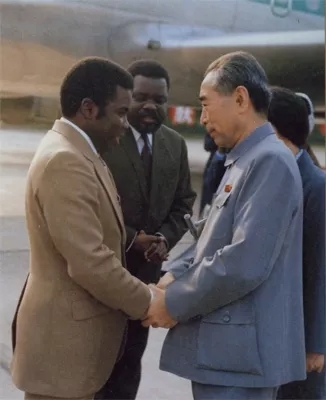 1973年7月,周恩来迎接刚果总统马里安·恩古瓦比。