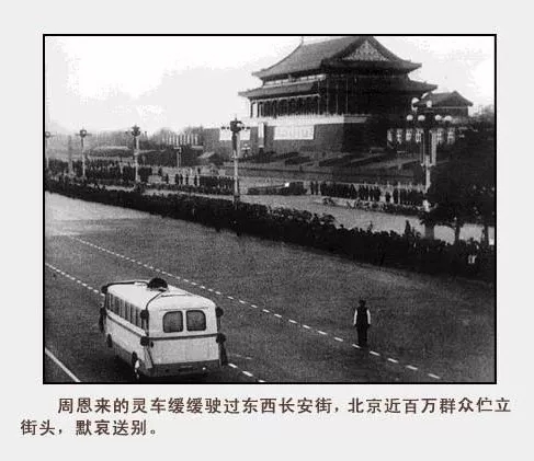运送周恩来遗体的灵车驶过长安街,北京百万市民自发伫立街道两旁默哀致意。