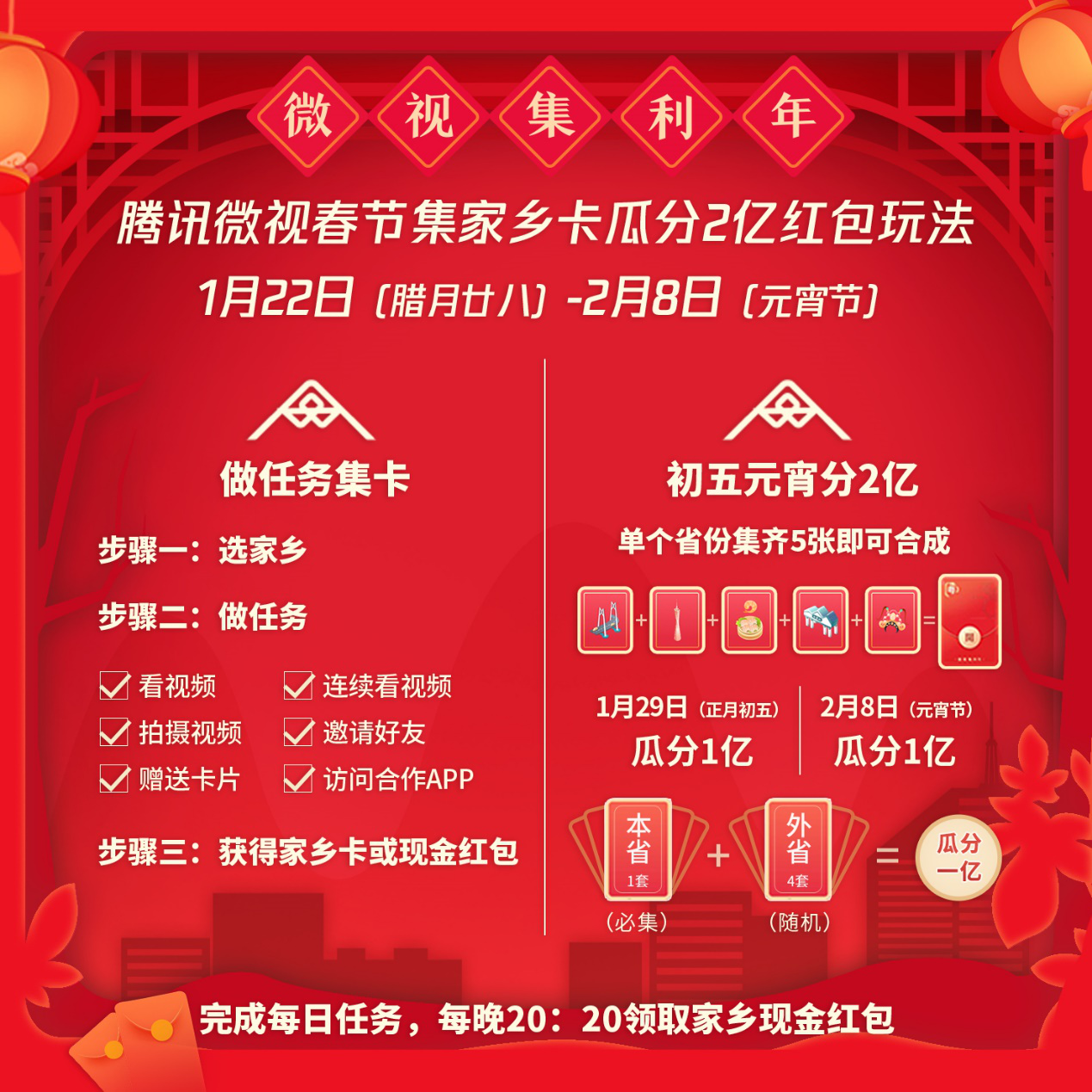在1月22日-2月8日的每晚20:20,参与集卡玩法的用户还能领取家乡百万红包。用户领取到红包后可以分享给10个好友,分享成功后自己也可以在其中领一个红包。
