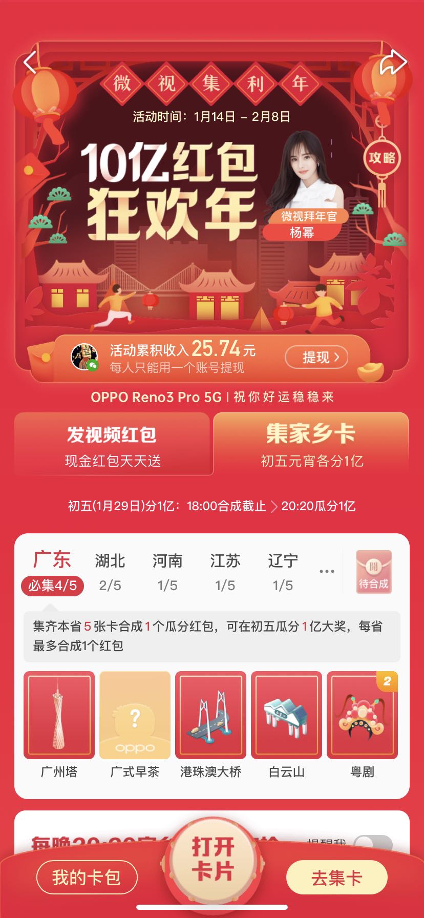 腾讯微视“集家乡卡”活动上线,集齐五张家乡卡初五元宵分两亿现金