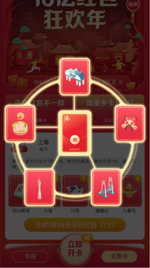 在1月22日-2月8日的每晚20:20,参与集卡玩法的用户还能领取家乡百万红包。用户领取到红包后可以分享给10个好友,分享成功后自己也可以在其中领一个红包。