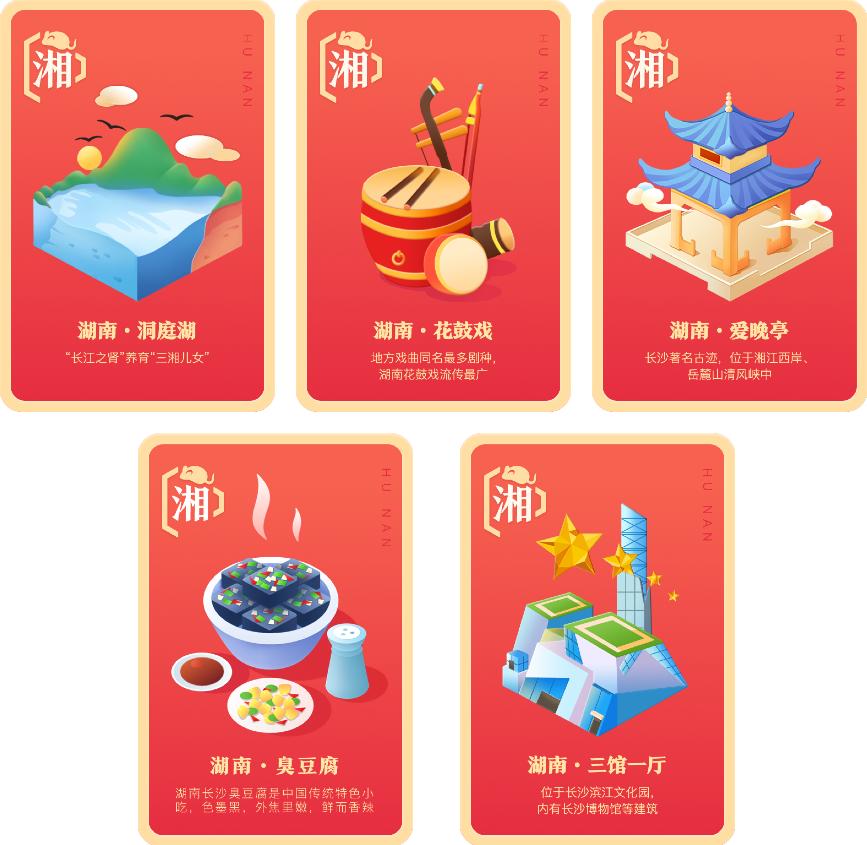 该玩法中所包含的卡片汇集了中国34个省级行政区的特色符号,每一套家乡卡都包括了美食卡、地标卡、风景名胜卡、文化卡、新时代卡五种类别,体现了全国34个省级行政区的地标、美食、文化等特点,微视则将最有代表性的五种元素凝聚在五张卡片中。