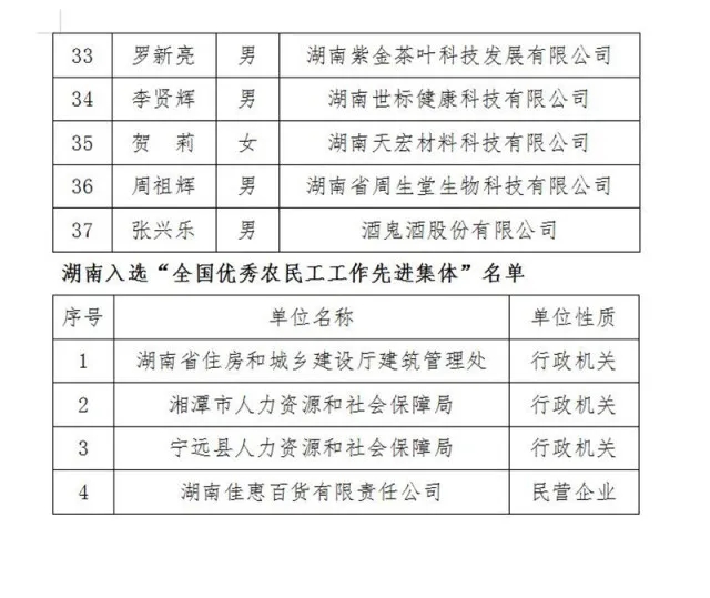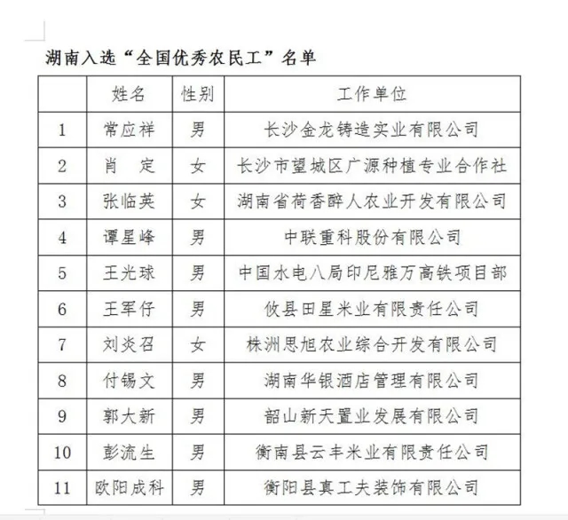 点个赞!湖南37位农民工和4个集体受国家表彰 稿源:湖南日报2021-01-09 21:51 您的浏览器不支持 video 标签。 您的浏览器不支持 audio 标签。 长沙晚报掌上长沙1月9日讯 据湖南日报消息:近日,国务院农民工工作领导小组在京召开全国优秀农民工和农民工工作先进集体表彰大会,表彰了一批全国优秀农民工和农民工工作先进集体。我省有37人、4个集体被评为全国优秀农民工和全国农民工工作先进集体。这37名优秀农民工来自全省各地,工作领域覆盖一、二、三产业,有农业公司农技员,扶贫车间技术骨干、农业合作社负责人等。 来看看有没有你熟悉的? 【作者:】 【编辑:谭伟】 长沙晚报社版权声明 关键词:表彰 >>我要举报