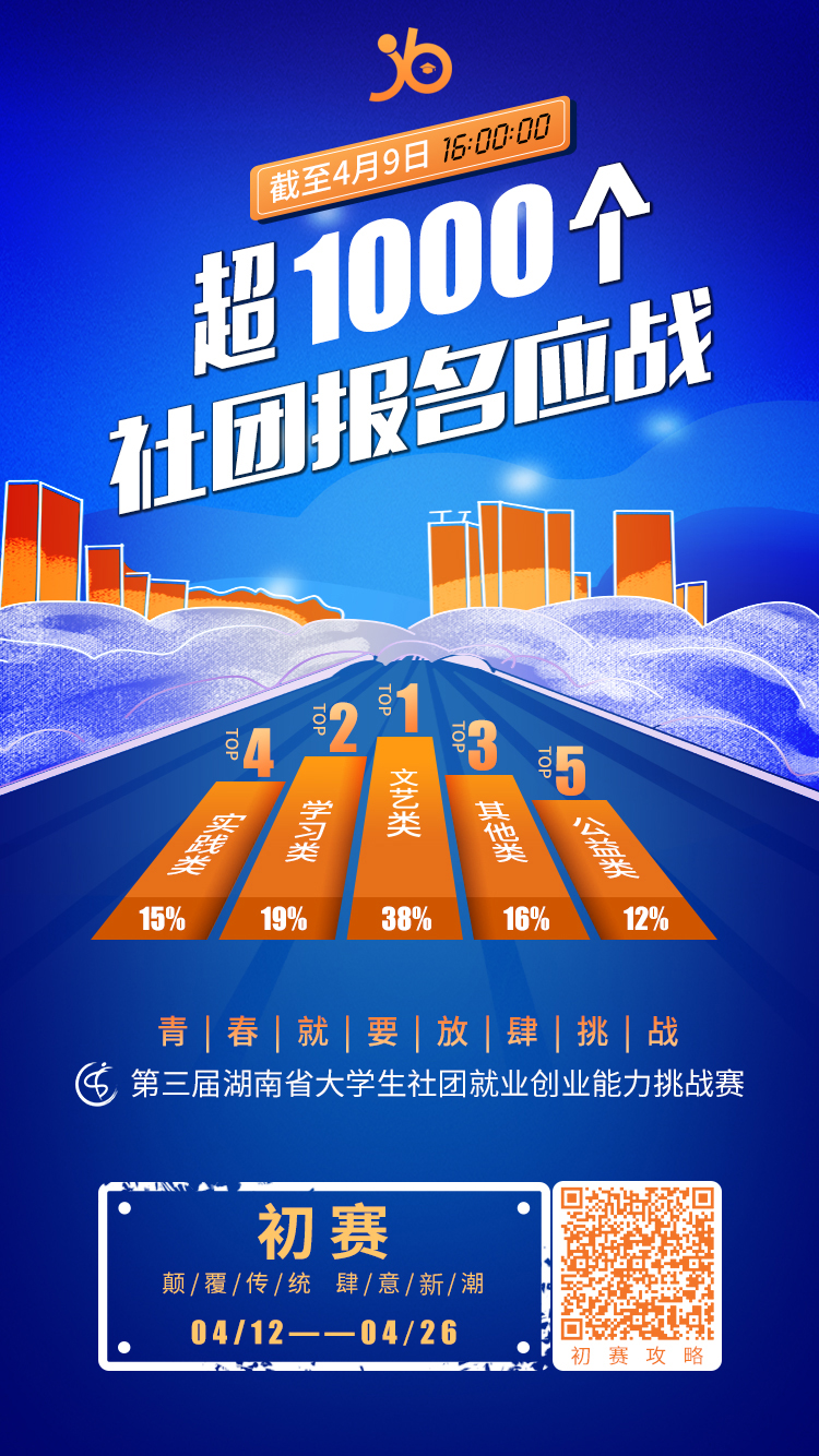 据举办方透露,暌违两年,今年“挑3”的到来在全省各大高校社团刮起了“最炫青春风”,大家纷纷踊跃报名、摩拳擦掌。其中,湖南科技大学、娄底职业技术学院、湖南应用技术学院在各高校社团报名数排名中位列前三强。值得一提的是,技工院校社团作为本届大赛新亮相队伍,报名启动后,即表现出敢拼敢闯的势头,报名社团数占比近20%。另外,五大类型社团中,文艺类社团报名占比达38%,这意味着进入初赛突围百强,这类参赛社团竞争将最为激烈。按照竞争激烈程度排名,其次分别为学习类、其他类、实践类和公益类社团。谁将争夺分组赛各类型社团的前20强?举办方透露,接下来的赛程将开启“创意设计”“模拟面试”“创业挑战”等新玩法,通过激发每位大学生创新精神和实践动手能力,全面帮助广大大学生提升自我,提高社会实践能力,激发就业创业潜能。