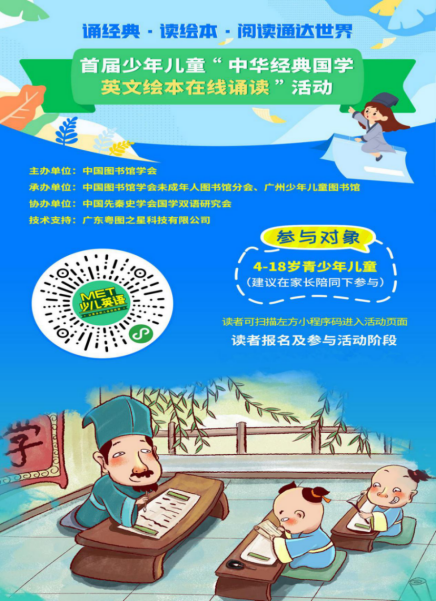 本次活动以“诵经典·读绘本·阅读通达世界”为主题,参赛者为4至18岁的青少年儿童,利用智能手机扫描微信小程序即可报名参与活动,按照微信小程序中提供的中华经典国学中英文对照读本在线诵读,每位参与者可选择不同的内容反复诵读。届时,系统将根据参赛者的即时得分和动态排序,将选手最高分数作为诵读最终成绩。此次活动旨在为广大青少年搭建一个展现自我、展现能力的平台,以此锻炼和提升英语口语能力,展现中华经典国学的无限魅力。