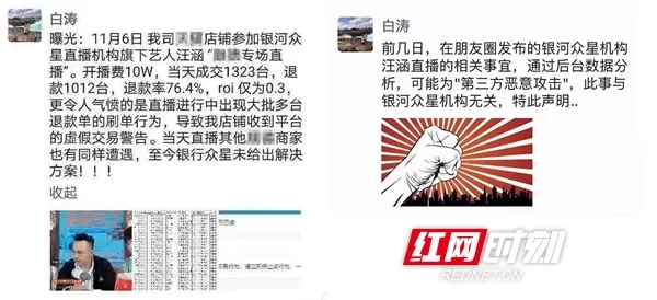 据红网时刻新闻记者了解,该事件源头是11月6日晚,由银河众星(海南)电子商务公司举办的一场由汪涵参加的在线直播。凌晨时,一位参与直播活动的商家白涛发现自己的网店突然涌进大量订单然后又很快撤单。这导致交易平台认为白涛在刷单,随即对白涛的网店进行了降权限流处理,这让白涛异常恼火。