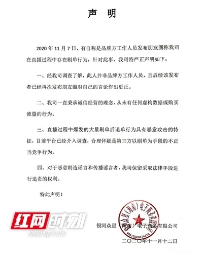 该负责人表示,银河众星早已注意到该事件的异常,包括直播间出现的70%退款率数据,以及随后在网上出现的大量恶意攻击文章。目前,银河众星数据中心对直播过程中突然爆发的大量异常数据在进行回溯和跟踪,公司有合理理由判断这是一次存在明显恶意攻击的“反向刷单”行为。公司已经正式要求平台介入调查,并聘请了专业律师团队,对此次异常电子数据进行存证取证,并将电子证据上传到互联网法院的专链进行证据固定。
