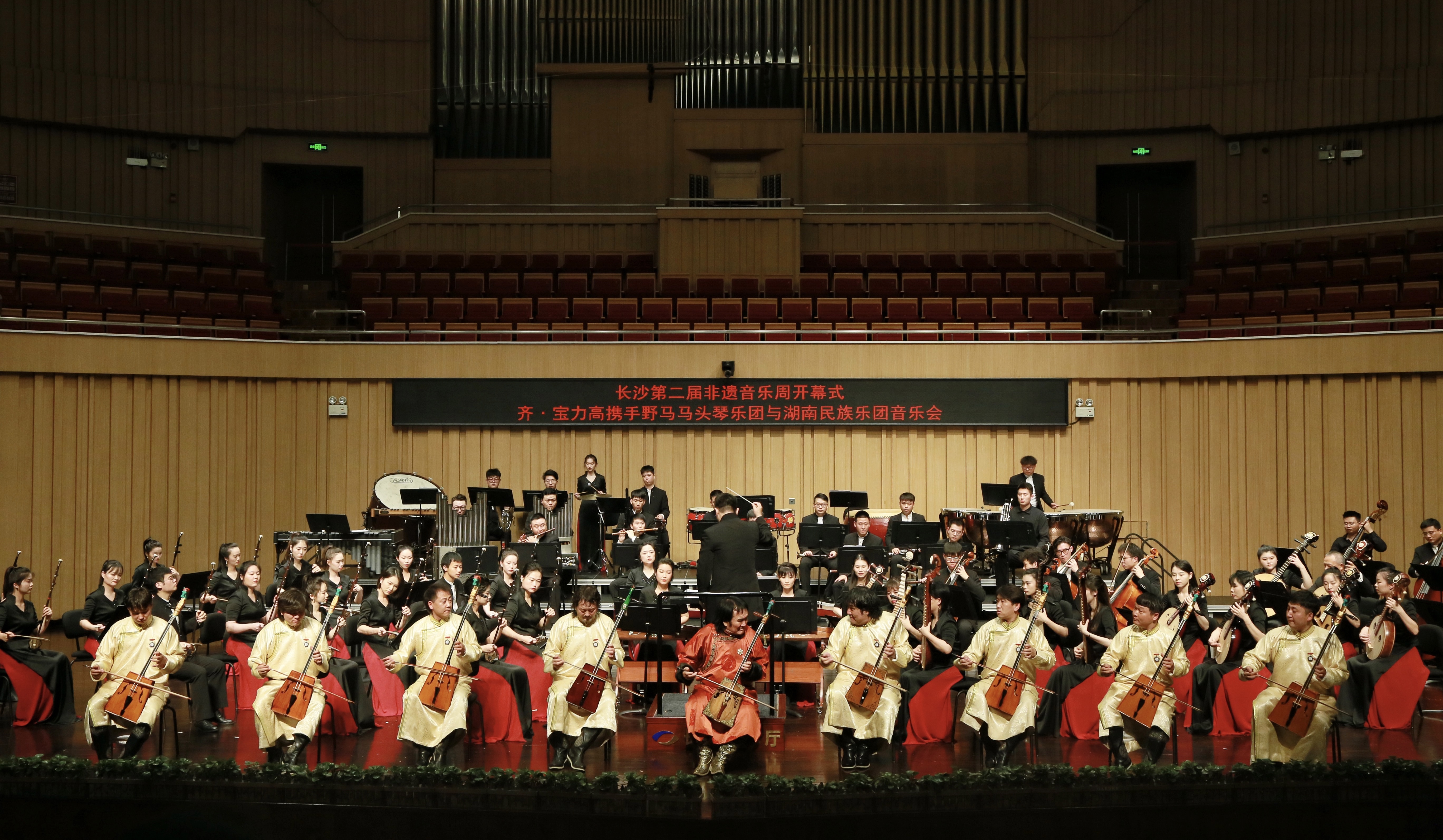 3日晚,长沙第二届非遗音乐周开幕式·乐赏非遗——齐·宝力高野马马头琴乐团与湖南民族乐团音乐会在长沙音乐厅震撼上演,音乐会特邀马头琴艺术大师齐·宝力高,江苏省民族乐团常任指挥、湖南民族乐团客席指挥张伟,与湖南民族乐团及野马马头琴乐团携手演绎,时而深情悠扬、时而激情奔放的琴声带领观众尽情领略大草原的壮美辽阔与蒙古族人民的热情豪迈。