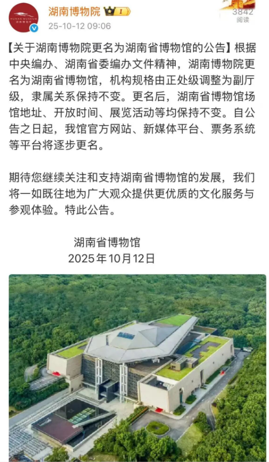 长沙晚报掌上长沙10月12日讯(全媒体记者 任波)12日,文博领域传来一则引人关注的消息:据新浪微博@湖南博物院发布公告,即日起“湖南博物院”更名为“湖南省博物馆”,同时机构规格由正处级调整为副厅级。此次更名与升级,标志着这家承载着湖湘文明的重要文化殿堂,在机构定位与事业发展上迈入了新的阶段。