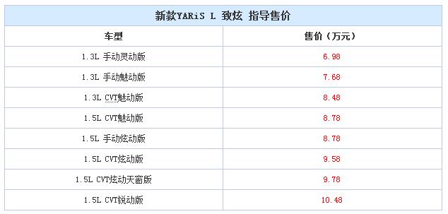 长沙晚报掌上长沙8月12日讯 据汽车之家消息 8月11日,广汽丰田正式宣布旗下新款YARiS L 致炫在国内正式上市,新车将推出两种动力共计8款车型。新车售价区间为6.98-10.48万元。详细售价请见下表:
