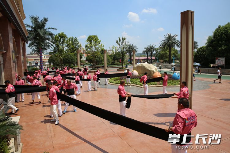长沙晚报掌上长沙7月22日讯(记者 张洋子 通讯员 周鹏伟)腰间缠着防滑布,用身体搭建起信任的塔基;随着鼓点响起,队员们逐一上爬,直到最顶层的小队员挥手示意……今日中午,株洲方特梦幻王国内,来自浙江德清桃花庄人塔队的150名队员和来自全国的350名志愿者联手搭肩,成功挑战8层人塔,为现场游客表演了精彩的叠人塔绝技。
