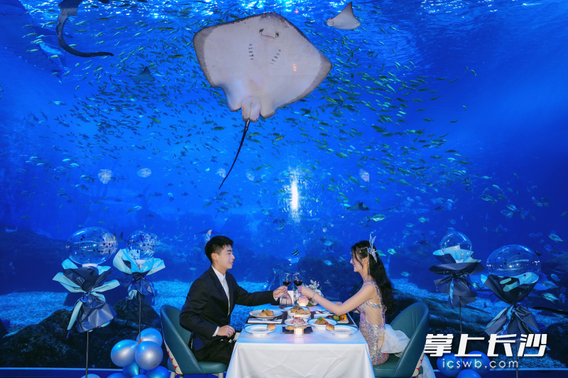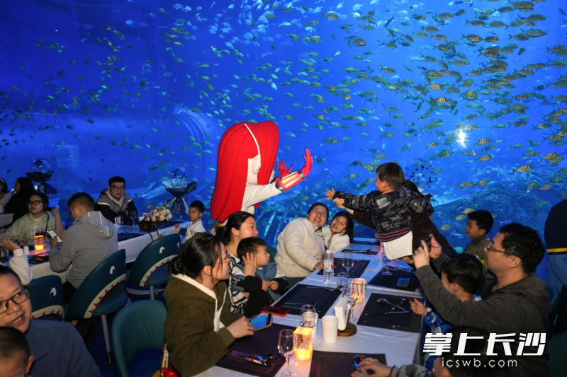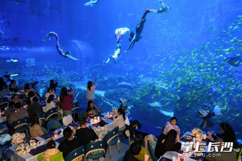 长沙湘江欢乐海洋公园的这场“鲸”奇鲛人夜宴,让大家感受到与白天热闹海洋氛围截然不同的静谧,抬头是蔚蓝大海,低头是美味佳肴,一切都是新奇体验。参与晚宴的孙女士表示,她小时候曾幻想过和美人鱼共进晚餐,今天终于在这里实现了,感到非常满足。