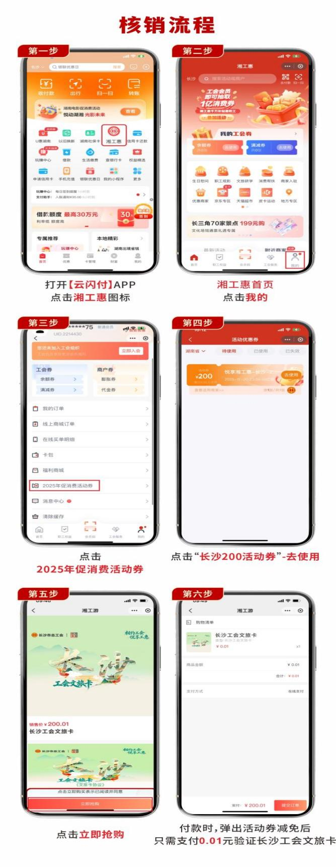 湖南工会会员中签“长沙工会文旅券”后请及时在线上核销,0.01元换购文旅卡;长沙工会会员中签普惠券后,需在20日内使用,避免错过福利。