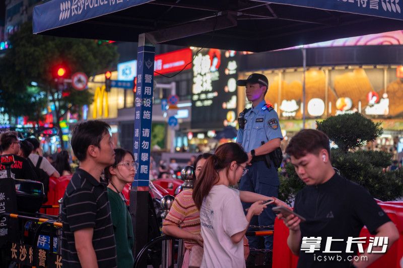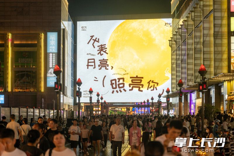 “月亮照亮归途,我们守护彼此。”步入时尚繁华的黄兴路步行街,志愿者和公安武警们组成了一道流动的风景线,他们为问路的游客耐心指引,配合疏导人流。一条串联起天心阁的古韵、火宫殿的烟火、黄兴路的繁华的温馨旅程,让传统美食的烟火气中更添一份浓郁的人情味。