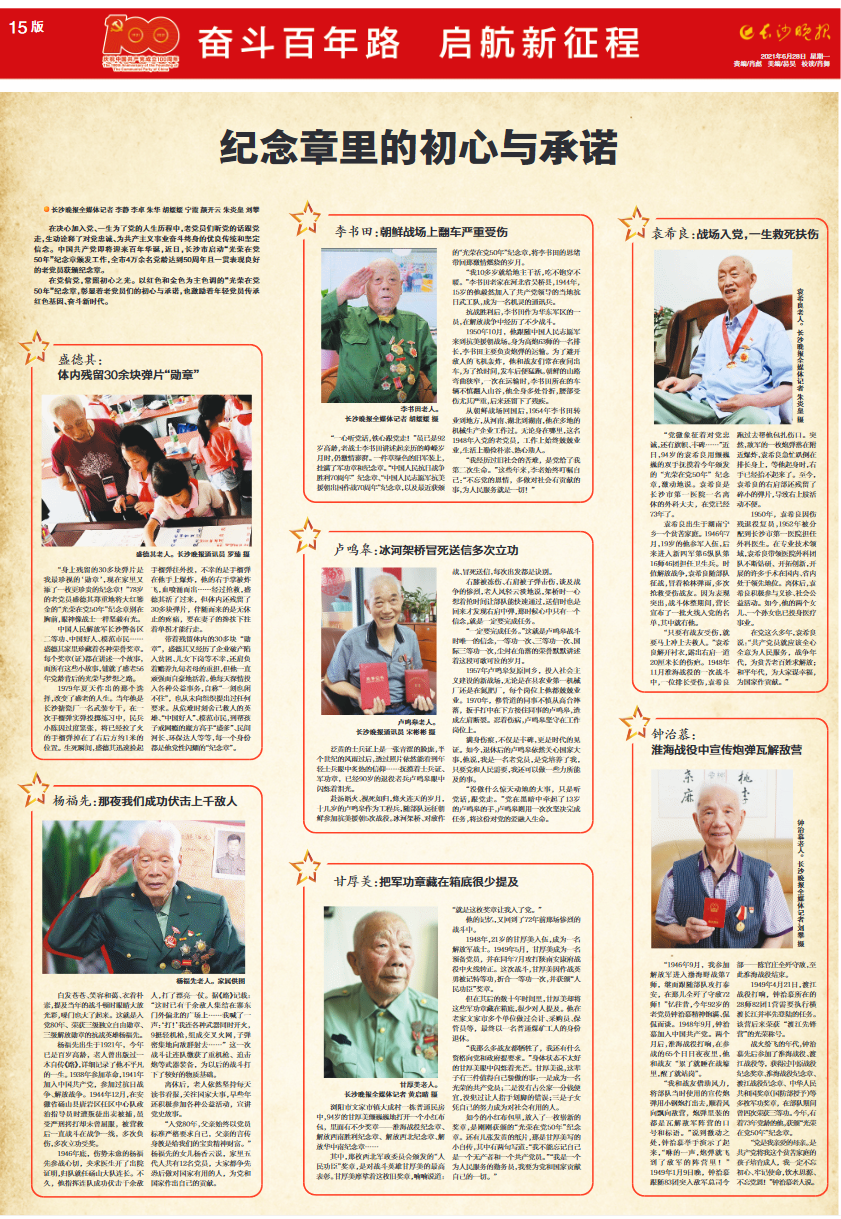 浏阳市文家市镇大成村一栋普通民房中,94岁的甘厚美颤巍巍地打开一个小红布包,里面有不少奖章——淮海战役纪念章、解放西南胜利纪念章、解放西北纪念章、解放华中南纪念章……