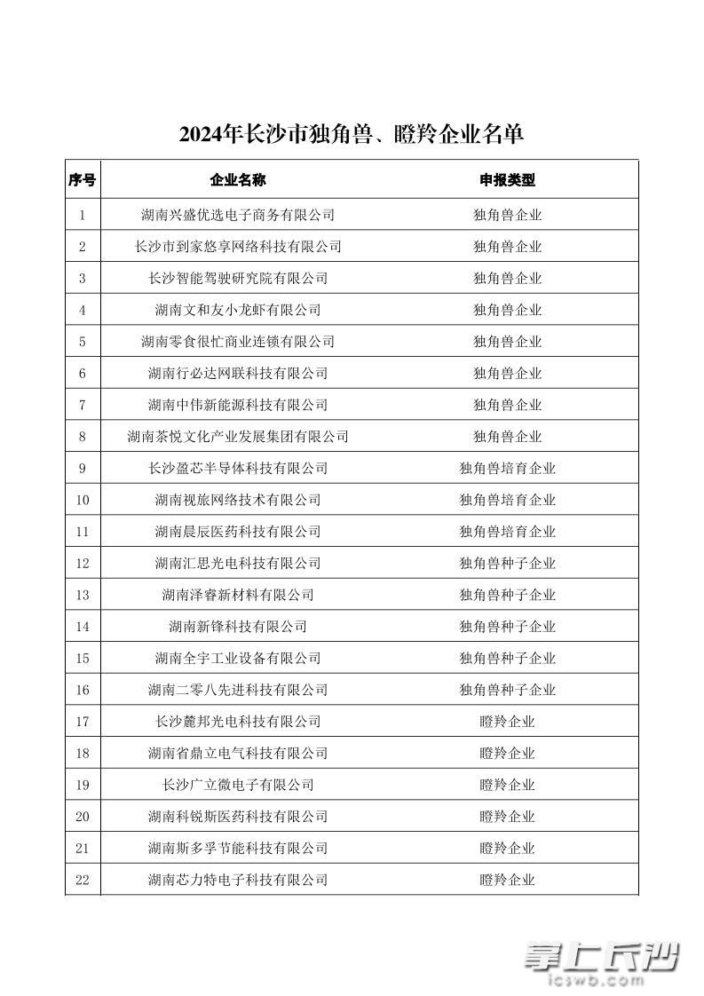 2024年12月,长沙市发展和改革委员会公布了2024年长沙市独角兽、瞪羚企业名单,其中独角兽企业有8家,瞪羚企业有103家;独角兽培育企业8家,瞪羚培育企业1家。