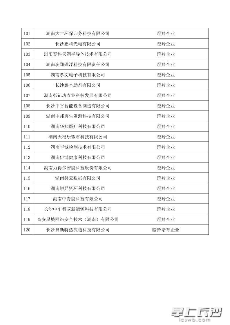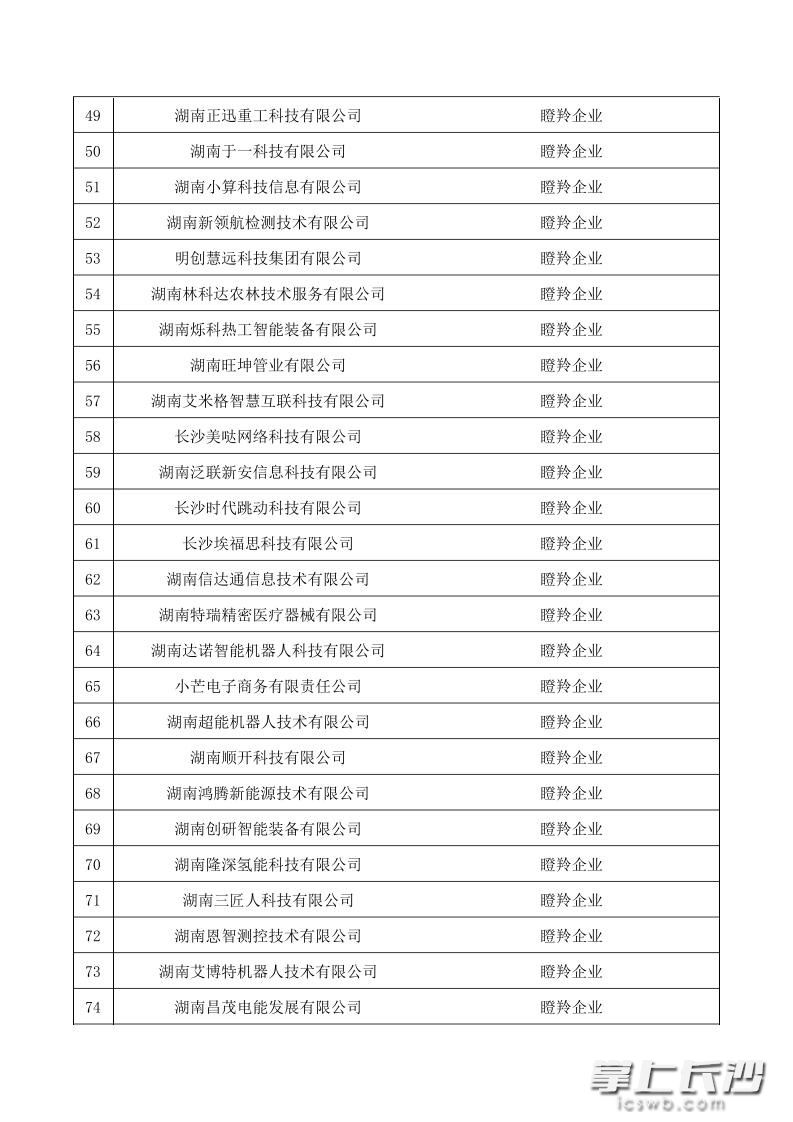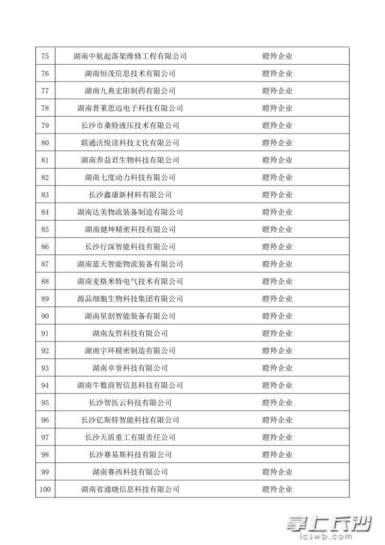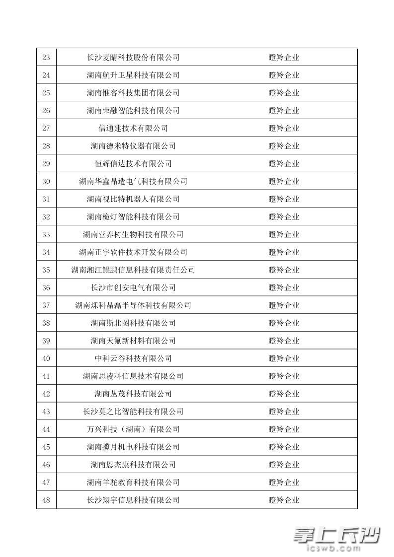 瞪羚企业包括湖南视比特机器人有限公司、湖南湘江鲲鹏信息科技有限责任公司、万兴科技(湖南)有限公司、长沙麓邦光电科技有限公司、小芒电子商务有限责任公司等。