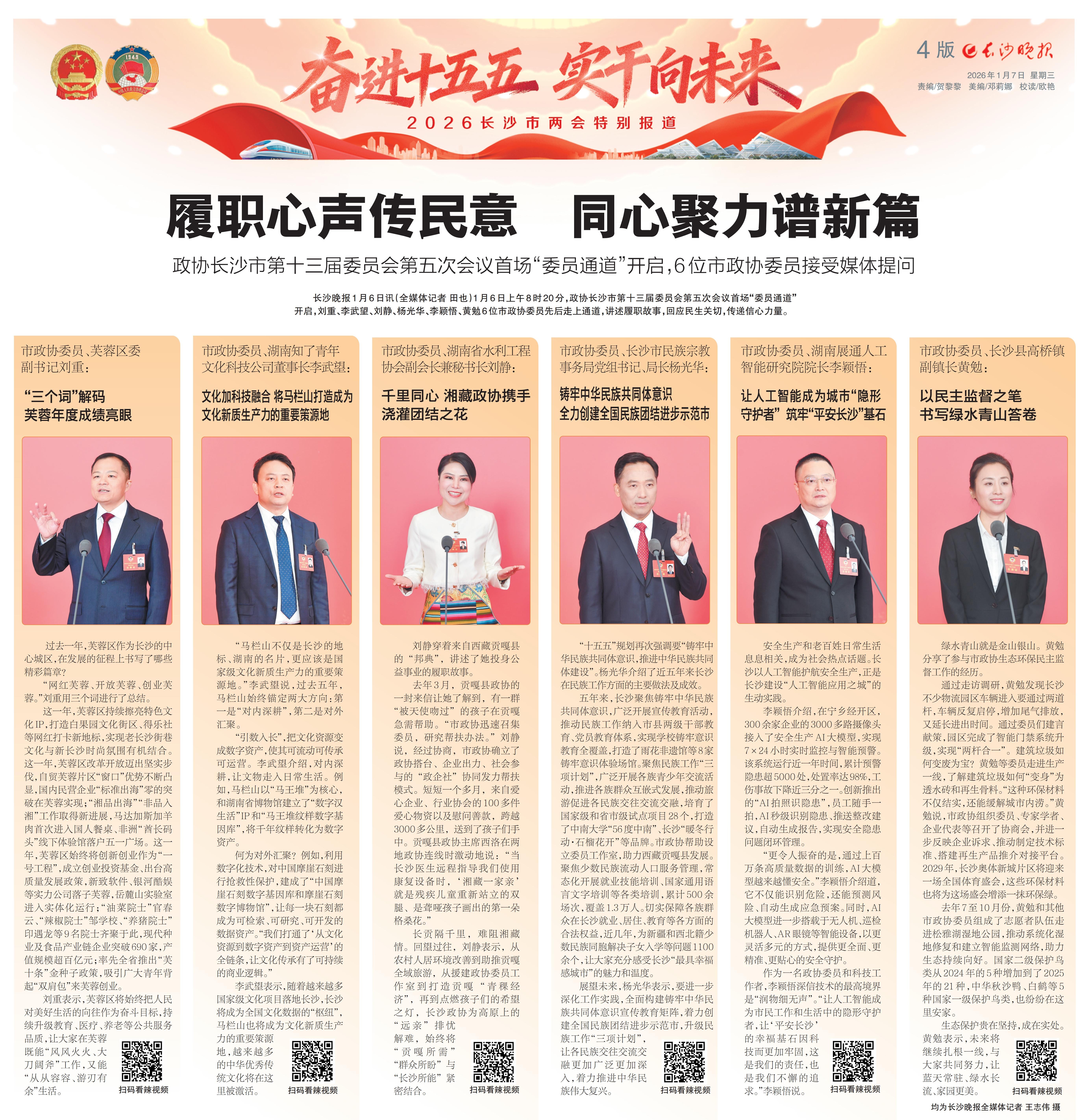 长沙晚报1月6日讯(全媒体记者 田也)1月6日上午8时20分,政协长沙市第十三届委员会第五次会议首场“委员通道”开启,刘重、李武望、刘静、杨光华、李颖悟、黄勉6位市政协委员先后走上通道,讲述履职故事,回应民生关切,传递信心力量。