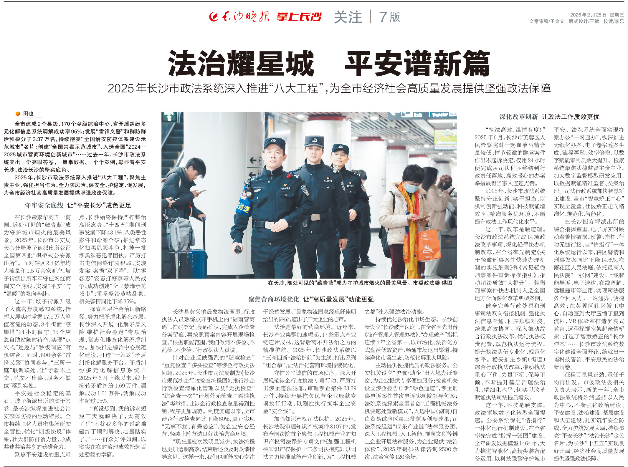 全市建成9个县级、170个乡级综治中心,省矛盾纠纷多元化解信息系统调解成功率95%;发展“雷锋义警”和群防群治积极分子3.37万名,持续擦亮“全国治安防控体系建设示范城市”名片;创建“全国禁毒示范城市”、入选全国“2024—2025城市营商环境创新城市”……过去一年,长沙市政法系统交出一份亮眼答卷,一串串数据、一个个案例,彰显着平安长沙、法治长沙的坚实底色。