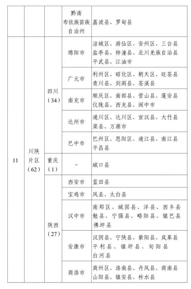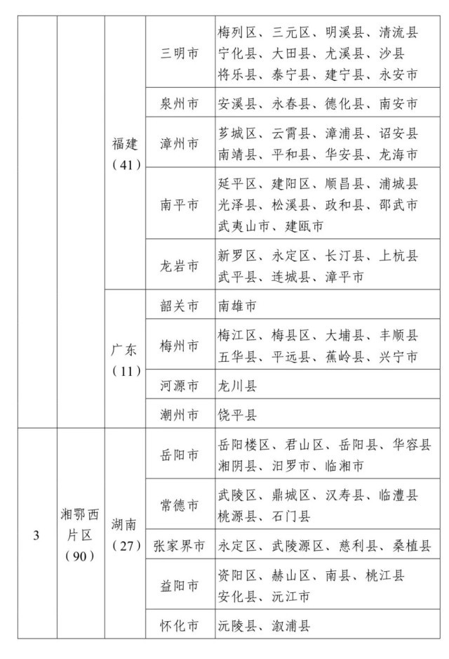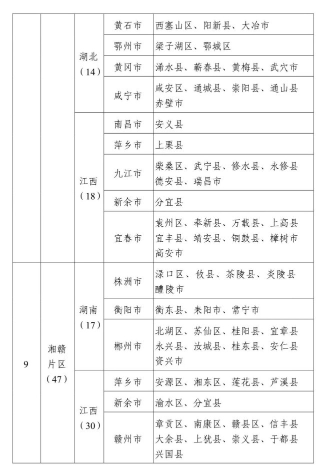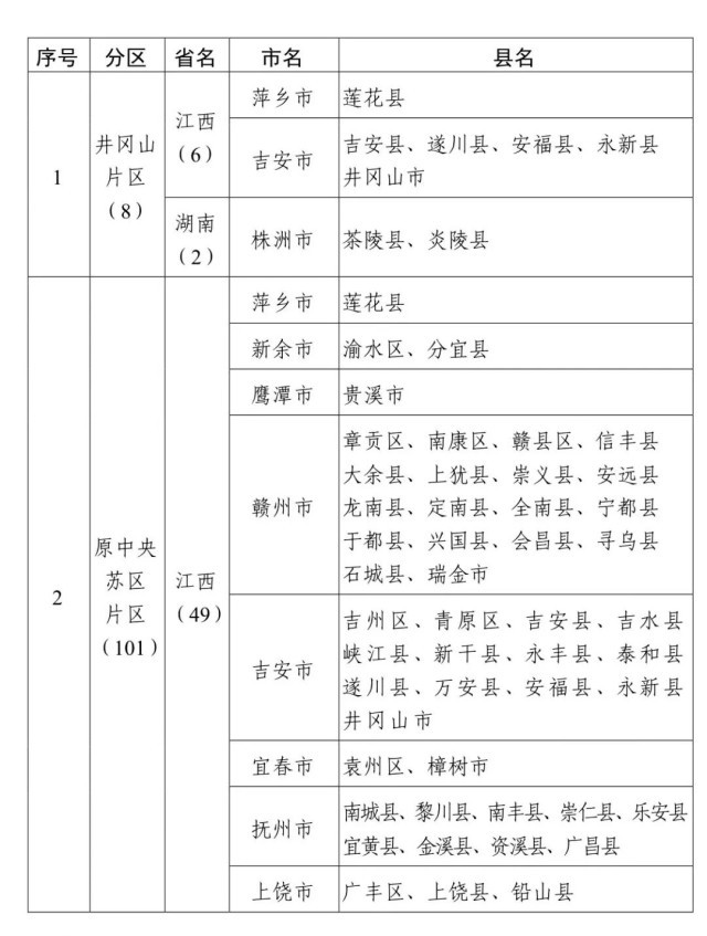 井冈山片区、原中央苏区片区、湘鄂西片区、海陆丰片区、鄂豫皖片区、琼崖片区、闽浙赣片区、湘鄂赣片区、湘赣片区、左右江片区、川陕片区、陕甘片区、湘鄂川黔片区、晋冀豫片区和苏北片区。
