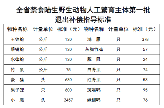 (三)补偿标准。考虑陆生野生动物人工繁育成本、养殖设施投入、养殖模式等因素给予一定补偿,具体指导标准见附表。