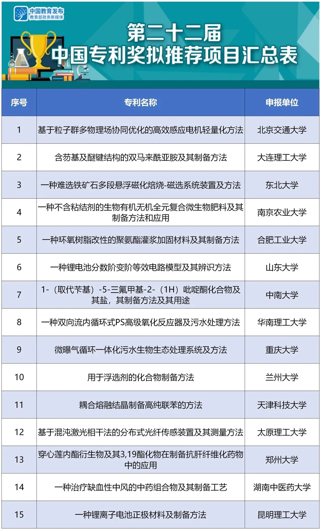教育部拟推荐15个项目申报第22届中国专利奖!湖南这两个高校入选