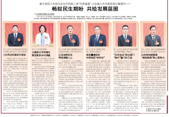 2月5日上午,省十四届人大四次会议第二场“代表通道”开启。杨琳、刘菲菲、刘万云、肖雄杰、张川、张友君等6位省人大代表走上“代表通道”,围绕产业发展、乡村教育、园区体制改革、科技创新等话题,接受媒体记者集体采访。铿锵的建言里,凝聚着三湘大地的创新力量;真切的发声里,传递着湖湘儿女的心声期盼。