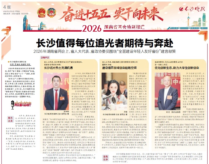 如何让广大青年在湖南有奔头、有舞台?如何精准回应年轻人的诉求,让年轻人爱上湖南、留在湖南,在湖南既能安居乐业,又能实现价值、收获成就感?2月5日,长沙晚报两会“新闻会客厅”邀请正在参加省两会的省人大代表、省政协委员,聚焦年轻人友好省份建设这一话题展开热议。