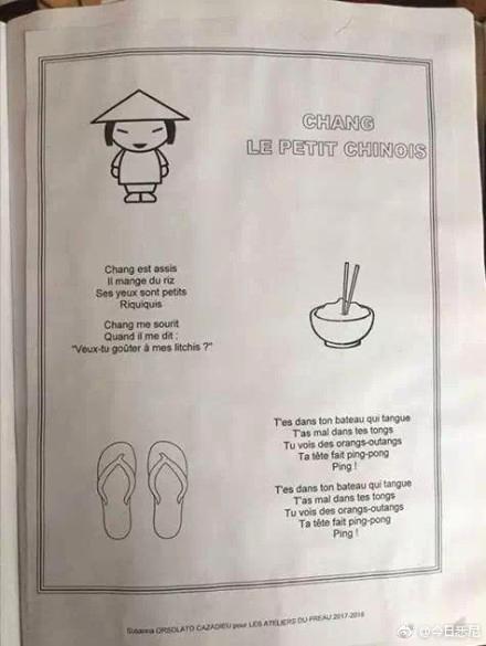 据法国《20分钟报》2017年12月30日报道,这一歌曲名为《张,我的矮个中国人》,歌词中充满侮辱华人的内容,包括“张坐着吃米饭,他的眼睛真小,小得好可怜”“坐在摇晃的小船中,脑袋晃荡如乒乓球砰砰响”。《费加罗报》称,巴黎郊区欧贝赫维利耶市一家幼儿园教授孩子们吟唱该歌曲超过10年,一些震惊的亚裔家长近日将它上传到社交网上才引发舆论关注。
