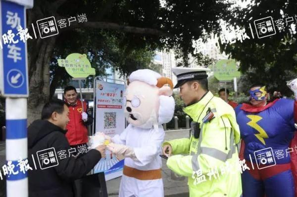 为了更好地宣传“车让人人快行”文明交通理念,在开具罚单之后,志愿者扮演的“慢羊羊”给“低头族”赠送了一只慢羊羊玩偶,希望他们下次能够快行通过斑马线;2名志愿者打扮成“闪电侠”,给快行通过斑马线的小朋友和家长赠送喜羊羊玩偶,点赞他们的行为。