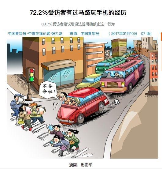 中国青年报社此前的一项调查显示,72.2%的受访者有步行过马路玩手机的经历,步行过马路时从不玩手机的受访者仅占27.8%。