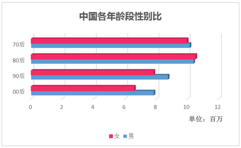 看看上图90后与00后中,女娃娃明显比男娃娃少了一大截。再联系我国老夫少妻的传统,70、80的大龄单身男青年还会娶走一部分“少妻”。