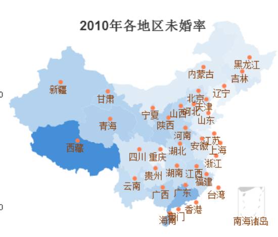 DT君继续根据第六次人口普查数据计算了个省市地区的未婚率,颜色越深的地方,未婚率就越高。西藏特别……高,DT君也不明觉厉,高原紫外线太强,爱美的女孩子都嫁出去了?