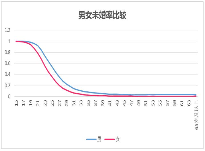 如上图,在20-30岁这一年龄段,男性未婚率比女性高太多。即使进入了所谓女性难嫁的30岁大龄阶段,女性的未婚率还是要比男性低。