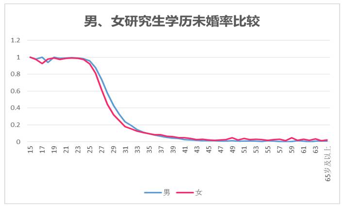 数据告诉我们,当大家都读到了研究生阶段,男女在各个年龄段的未婚率相当接近。到了四十好几,不管怎样都是能结婚的。