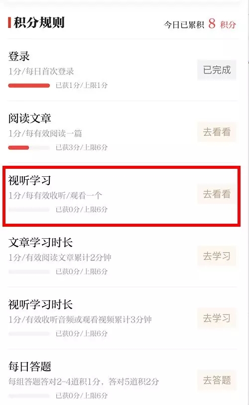 每有效收听一个音频或观看一个视频积1分,每日上限积6分。