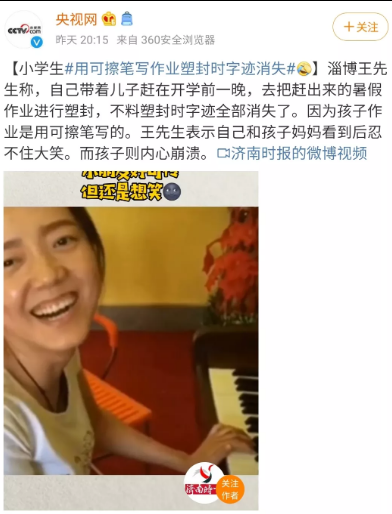 年度最绝望! 山东一小学生用可擦笔写作业,开学前一晚字没了...