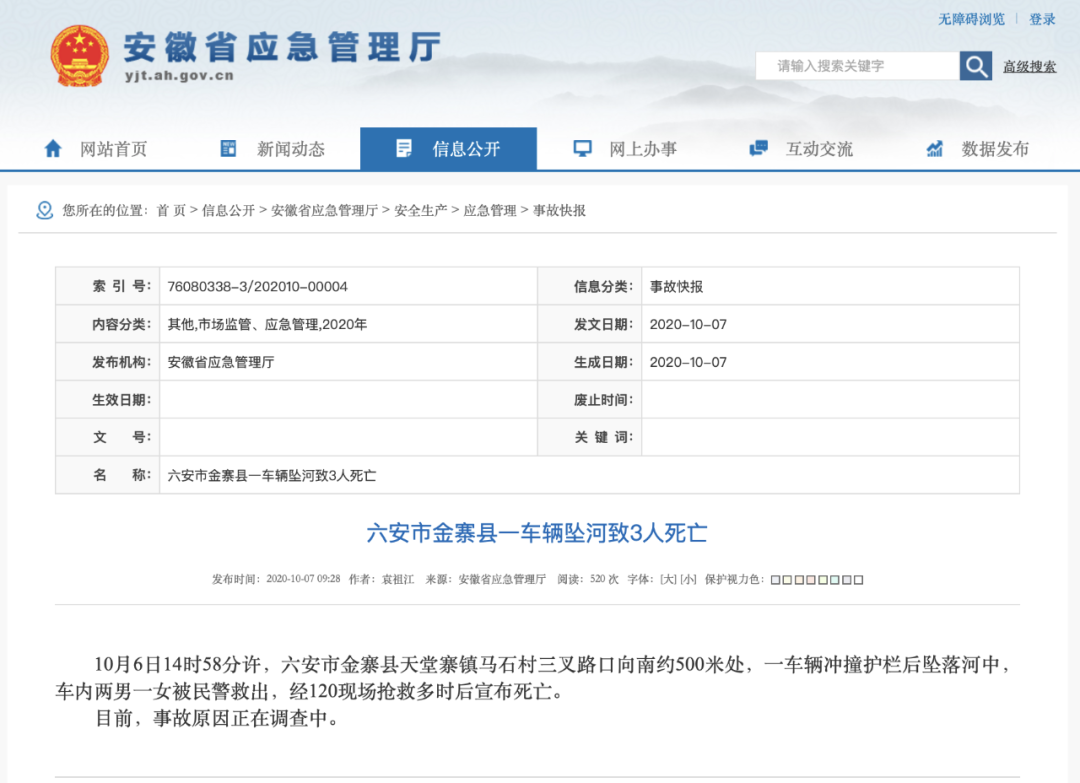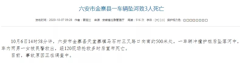 据安徽省应急管理厅官网此前消息,10月6日14时58分许,六安市金寨县天堂寨镇马石村三叉路口向南约500米处,一车辆冲撞护栏后坠落河中,车内两男一女被民警救出,经120现场抢救多时后宣布死亡。目前,事故原因正在调查中。